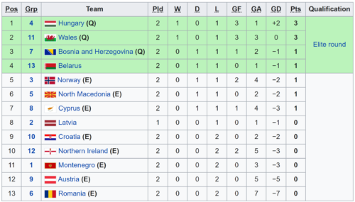 UEFA przy wyłanianiu najlepszych drużyn z trzecich miejsc postanowiła aby faktycznie były to zespoły najlepsze, w efekcie w zestawieniu wliczane są jedynie punkty zdobyte przeciwko zespołom z miejsc 1. i 2. w danej grupie, natomiast rezultaty uzyskane z najsłabszym, czwartym zespołem nie są brane pod uwagę. W efekcie tego po meczu Łotwy ze Szwecją tabelka zespołów z trzecich miejsc prezentuje się następująco:
