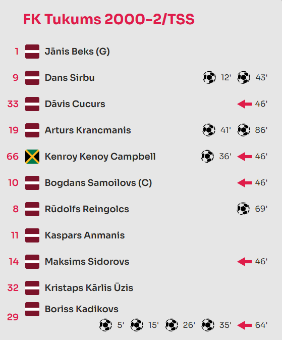 Rezultātu un līmeņa starpību noteica nevis tas, ka FK Salaspils spēlē zemākā līgā, bet galvenokārt tas, ka Tukuma komandas krāsās uz laukuma izgāja spēcīgāks sastāvs nekā parasti. Uz šo spēli ieradās daudz spēlētāju no pirmās komandas. Zemāk atrodas saraksts ar spēlētājiem un viņu spēļu skaitu Virslīgā šogad.