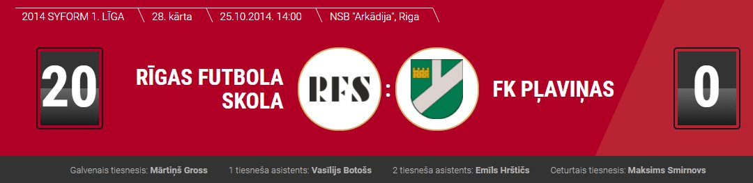 2014. gada 25. oktobrī maz cilvēku sagaidīja šādu katastrofu. Pirmā spēle starp abām komandām beidzās ar Pļaviņu zaudējumu viņu pašu stadionā 0-7. Oktobra maču labi atceras toreizējais RFS uzbrucejs Aleksejs Rosoha, kurš tad guva 11 vārtus savas komandas labā!