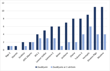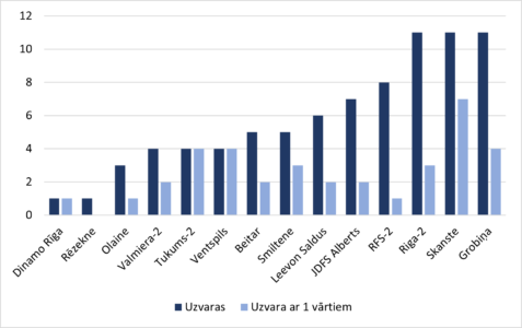 Interesanti, ka, apskatot komandu uzvaru skaitu un to, cik to ir ar vienu vārtu pārsvaru, izceļas “Skanste”, kurai no 11 uzvarām ar 1 vārtiem bijušas septiņas, “Ventspilij” un tukumniekiem – 4/4.