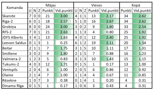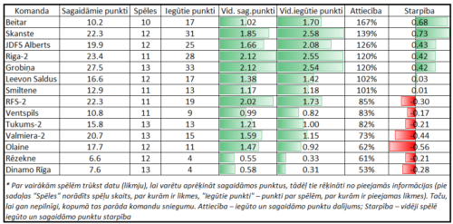 Arī “Skanste” (par aptuveni 9 punktiem vairāk, kas vidēji spēlē dod par 3/4 punkta vairāk), albertieši, “Riga” dublieri un “Grobiņa” (par 20% vairāk) ir zaļajā zonā (skatīt tabulu). Vāji pirmo apli aizvadījusi, neskaitot tabulas apakšā esošos, “Olaine”, Valmieras dublieri, kā arī, sliktāk aizvadot apļa beigas, RFS-2.