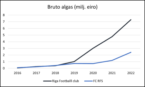 Atgriežoties pie Rīgas milžu gada pārskatiem, redzams, ka “Riga” 2022. gadā atlīdzība par darbu bija 7.31 miljons eiro, no tiem 5.72 miljoni bija profesionālajiem sportistiem (1.59 miljoni eiro bija “atlīdzība ADM un treneru personālam”). Šāda veida iedalījums ierakstīts pirmo reizi, 2021. gadā bija atsevišķi atlīdzība pārvaldes locekļiem (924 tūkstoši eiro) un atlīdzība pārējiem darbiniekiem (3.83 miljoni eiro).
