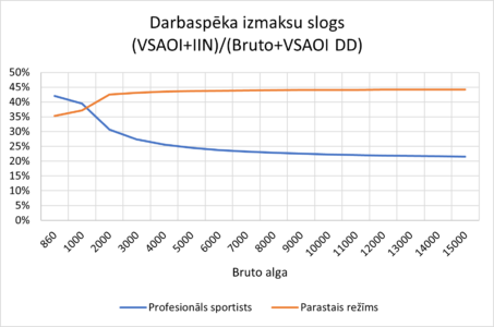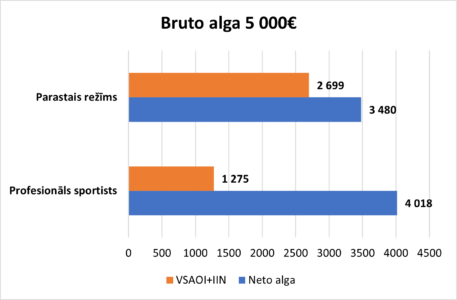 Maksājot 5 000 bruto algu, uz rokas profesionāls sportists saņem aptuveni par 500 eiro vairāk nekā parastajā nodokļu režīmā, bet nodokļos samaksā divreiz mazāk (gan IIN mazākas likmes, jo nepiemēro 23% un 31% likmi, gan ar VSAOI mazākas daļas aplikšanas dēļ). Tādēļ arī sanāk – jo lielāka bruto darba alga profesionālajam sportistam, jo mazāks darbaspēka izmaksu slogs.