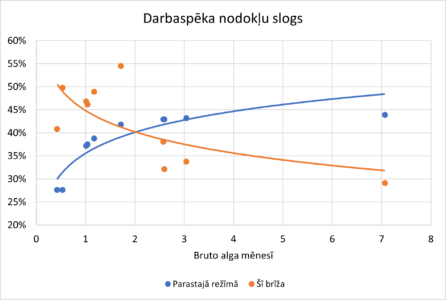 Ja sportistam maksā bruto algu 500 eiro vai 10 000 eiro apmērā, nav atšķirības nomaksātajās VSAOI (pie visiem algu līmeņiem tie būs 293.17 eiro). Salīdzinot četru bagātāko Latvijas klubu un četru mazo Virslīgas klubu samaksātos nodokļus 2021. gadā, atšķirība ir vairāk nekā 4 reizes (lielais četrinieks samaksā 2.83 miljonus eiro, bet četri mazākie klubi, kas ir lielas akadēmijas un kurās netiek (vai vispār nemaksā) maksātas lielas algas profesionālajiem sportistiem, – 0.69 miljonus eiro. Iedzīvotāju ienākumu nodokļa nomaksā atšķirība ir vēl lielāka (gandrīz 8 reizes, lielākajiem nomaksājot 1.77 miljonus eiro), bet VSAOI ir tikai 2.3 reizes (tas izskaidrojams ar labvēlīgo VSAOI objektu 860 eiro). Ja pārrēķina uz vienu darbinieku (jo bagātākajiem ir 178, bet akadēmiju klubiem – 108 darbinieki), tad atšķirība ir daudz mazāka: kopā nomaksāto nodokļu summa Top4 ir 15.9 tūkstoši eiro gadā, bet akadēmiju klubiem – 6.4 tūkstoši eiro (2.5 reizes atšķirība), VSAOI mazākie klubi nomaksā 4.1 tūkstoti eiro, bet Top4 – tikai 5.7 tūkstošu eiro. Zemāk aplūkojams attēls, kurā attēloti šo klubu darbaspēka nodokļu slogs šī brīža situācijā un parastajā režīmā, ja nebūtu šī īpaša nodokļu režīma profesionālajam sportistam. Parastajā režīmā darbaspēka nodokļu slogs pieaugtu līdz ar bruto algas pieaugumu, taču šobrīd esošajā viss ir otrādāk: jo lielāka alga, jo mazāks nodokļu slogs (šajā attēlā aprēķinātais darbaspēka nodokļu slogs nav tik precīzs, jo tas ir par vidējo bruto algu biedrībā, nevis par katru darbinieku).