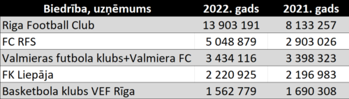 Kā redzams tabulā, šajā bagātāko Latvijas sporta klubu Top5 ir 4 futbola un 1 basketbola komanda (te gan jāatzīmē, ka nav vēl iesniegts “Auda” gada pārskats, kas var basketbolu izbīdīt no 5. vietas).