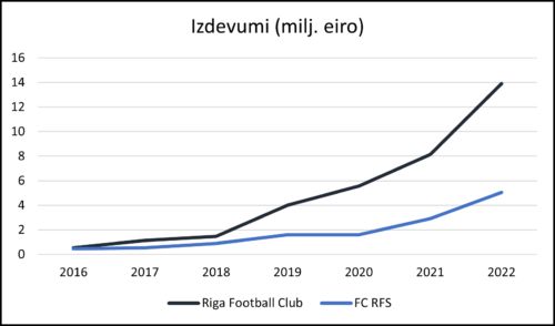 Šo divu Rīgas komandu budžeti ir strauji auguši, it īpaši tas attiecināms uz “Riga”, kuras izdevumi 2018. gadā nesasniedza pusotru miljonu eiro, bet šobrīd (2022. gadā) ir gandrīz 14 miljoni eiro. RFS 2022. gadā tērēja 5 miljonus eiro, salīdzinot ar iepriekšējo gadu, ir kāpums par 2.1 miljonu eiro (“Riga” +5.8 miljoni eiro). Vistuvāk šiem abiem klubiem ir “Valmiera”, kas tērē aptuveni 3.4 miljonus eiro, FK “Liepāja” budžets ir nedaudz virs 2 miljoniem eiro (2021. gadā 2.197 miljoni, 2022. gadā 2.221 miljons eiro). Turklāt liepājnieki ir atzinuši, ka šogad izdevumi būs mazāki.