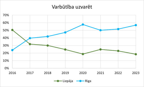 Ir izteikta tendence “Riga” iespējamībai uzvarēt pieaugt. Turklāt šogad, kā izskatās, ņemot vērā, ka šī bija “Liepājas” mājas spēle, varbūtība uzvarēt Tamaza Pertijas trenētajai komandai samazināsies vēl. Piemēram, šajā spēlē “Riga” uzvaras varbūtības bija 56.8%, “Liepājas” – 18.5% (ka būs neizšķirts – 24.7%)