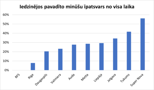 Ja mēģināt saskatīt kaut ko RFS augšējā grafikā, tad nav vērts – RFS ne minūti no kopā 1 350 minūtēm nav bijusi zaudētāju lomā. Tāpat teicama ir “Riga”, kura 7.9% minūšu bijusi iedzinējos (2. kārtā derbijā pret RFS un Daugavpilī 6. kārtā). Pārliecinoši visilgāk jeb 758 minūtes (56.1%) iedzinējos atradusies šī brīža vājākā Virslīgas komanda “Super Nova”.