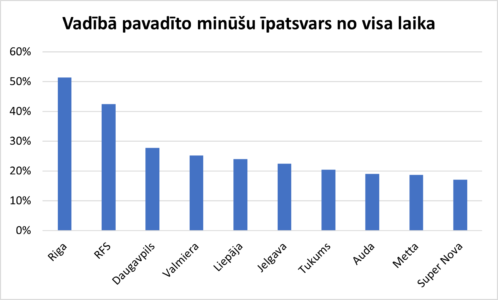 Ne tikai iegūto punktu skaits, iesisto un ielaisto vārtu guvumu skaits, bet arī tas, cik ilgi abas Rīgas lielās komandas pavadījušas, esot vadībā, parāda 2023. gada Virslīgas spēku dažādību. “Riga” ir vienīgā komanda, kas spējusi vairāk nekā pusi no visa laika (694 minūtes) būt priekšā – 51.4%. Tas ir par 21% ilgāk nekā RFS (573 minūtes jeb 42.4%, proti, par 9 procentpunktiem mazāk), kas tik tikko aizvadītajā Rīgas derbijā spēles ziņā (Emersona iespēja mača beigās!) izskatījās nedaudz, bet labāk par savu konkurenti.