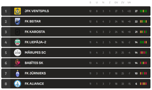 JFK “Ventspils”, kas pagājušogad palika 2. vietā 3. līgas Rietumu zonā un ieguva tiesības pakāpties līgu augstāk, šogad 2. līgas Rietumu zonā atrodas 1. vietā.
