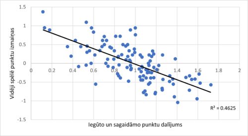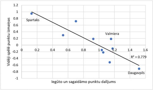 Tika iegūta negatīva korelācija ar augstu līmeni (-0.883), proti, jo zemāks iegūto un sagaidāmo punktu dalījums, jo lielākas caurmērā spēlē punktu izmaiņas. Redzamajā grafikā izceltas trīs komandas: “Daugavpils”, kurai lielākais iegūto/sagaidāmo punktu dalījums 1. aplī un sliktākais sniegums pārējos apļos, “Spartaks”, kuram abi rādītāji otrādi, un čempione “Valmiera”, kura vienīgā spējusi uzlabot vidēji mačā iegūto punktu rādītāju, ņemot vērā, ka sniegums pirmajās 9 spēlēs bija jau labāks, nekā tika gaidīts.