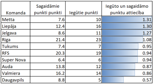 Šīs sezonas pirmais aplis izceļas starp sezonām, kas apskatītas no 2010. gada. Tā ir “Riga” un viņu sagaidāmais sniegums – nav bijis tik liela favorīta šajā laika posmā (tabulā komandas, kurām sagaidāmie punkti vidēji spēlē sasniedz vismaz 2.00).