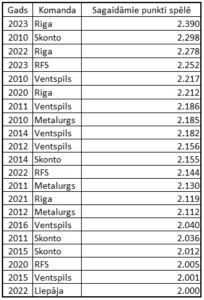 Turklāt iepriekšējo labāko rādītāju – 2010. gada “Skonto” ar 2.298 – apsteidz gandrīz par veselu desmitdaļu no punkta mačā!