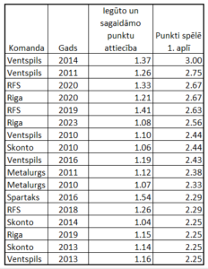 “Riga” šogad 1. aplī paveiktais (2.56 punkti vidēji mačā) nav labākais rezultāts kopš 2010. gada. Jau pieminētais 2014. gads ar “Ventspils” čempionu titulu – pirmajā aplī iegūti 27 punkti 9 spēlēs. Izceļas 2020. gada sezona ar abu Rīgas grandu dominanci: iesāka ar 2.67, taču nākamajos apļos arī iespaidīgi 2.50 (“Riga”) un 2.33 (RFS) punkti spēlē.