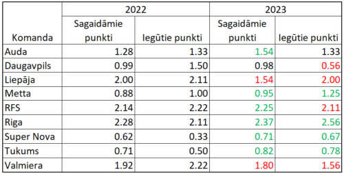 Par spīti tam, ka jau 2022. gada 1. aplī tika uzskatīta par favorītu, tas ir, par komandu, kas potenciāli var iegūt visvairāk punktu, “Riga” ir uzlabojusi savu sniegumu spēlēs (iegūtie punkti vidēji spēlē), kā arī citu – bukmeikeru – acīs par lielāku grandu. Tāpat “Tukums”, “Super Nova”, “Metta”, “Auda” un RFS – no šīm komandām sagaida vairāk nekā iepriekšējā gadā. Lai gan gaidas arī par esošajiem čempioniem ir samazinātas (kas loģiski), tomēr te izceļas “Liepāja”: 2022. gadā 1. aplī sagaida no viņiem 2.00 punktus mačā, šogad tikai 1.54 (-23%). Tātad, ja no liepājniekiem gaidītu tikpat, cik 2022. gadā, viņu sniegums (iegūtie/sagaidāmie punkti) būtu savā līmenī (1.00).