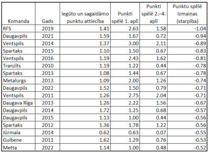 “Daugavpils” no Virslīgā visām komandām, kas spēlējušas no 2010. gada vismaz divās sezonās, ir labākā pēc vidējā iegūto un sagaidāmo punktu attiecības (1.17). Daugavpiliešiem ir arī labākais viena gada rezultāts šajā rādītājā – Virslīgas debijas sezonā pirmajā aplī 1.72 (punkti spēlē 1. aplī bija 1.25, nākamajos – 0.68). Tas nav arī pats lielākais caurmērā mačā punktu kritums: 2019. gada sezonā RFS, aizvadījusi lielisku pirmo apli (pirmajā aplī ieguva 21 no 24 maksimāli iespējamajiem jeb 2.63 punktus spēlē), aizvadīja katastrofālu turpinājumu, no 2. līdz 4. aplim iespējot 1.58 punktus vidēji spēlē (-1.04). “Liepājas” paveiktais pirmajā aplī ir atzīmējams: no 2014. gada viņi pirmajā aplī sasnieguši 2.00 punktu spēlē atzīmi tikai trīs reizes (2018., 2023. – 2.00, 2022. – 2.11).