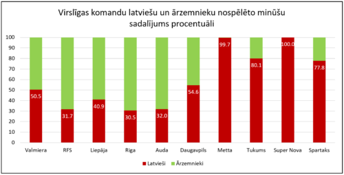 “Metta” un “Super Nova” latviskākās komandas pirmajā aplī: “Super Novai” 100% spēlētāju ir latvieši (Askerovs skaitās ATP, tāpēc latvietis; piezīme par FK “Auda” – Ogundži arī skaitās ATP (man nav zināms, tieši no kuras kārtas, tāpēc pieskaitīts pie ārzemniekiem), mettiešiem – 99.7%, jo Muritala vakardien atgriezās Virslīgā, taču nospēlēja vien pirmās 30 minūtes. Redzams, ka tikai četras komandas – RFS, “Riga”, “Liepāja” un “Auda” – izmanto vairāk leģionārus nekā latviešus, proti, virs 50% no nospēlētajām minūtēm. “Riga”, RFS un “Auda” šis rādītājs ir ap 31%–32%, liepājniekiem – 41%, bet “Valmiera” latviešus izmanto nedaudz vairāk nekā ārzemniekus (2021. gadā ārzemnieku īpatsvars bija 65%). Vēl izceļama komanda ir “Spartaks”, kurai latviešu īpatsvars šogad ir 78% (pretēji 2021. gada rādītājām – 44%)!