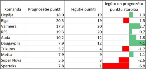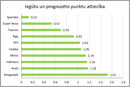 Apskatot Virslīgas pirmo apli (lai gan vēl nepabeigtu), var redzēt (kā pirmajā diagrammā), ka komandām ir klājies dažādi. Rādītājā “iegūto un prognozēto punktu attiecība” [1] pati sliktākā (0.13) komanda ir “Spartaks”, kas izcīnījusi tikai vienu punktu, kaut bija gaidāms, ka būs aptuveni 8 punkti (1. tabula). Apskatot “Super Novas” iespēto – 3 punkti, lai gan pēc bukmeikeru likmēm bija gaidāmi 5–6 punkti –, jāsaka, ka, manuprāt, Virslīgas debitante pēc manām gaidām pat ir izskatījusies labāk (un sniegums arī bijis labāks), bet šajā rādītājā ir starp četrām komandām, kurām iegūto un progozēto punktu starpība ir negatīva.