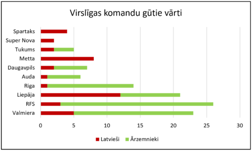 Un pēdējais, ko izvēlējos apskatīt, ir komandu gūtie vārti (un tieši kuri – leģionāri vai latvieši – devuši lielāku devumu). Ja apskata kopumā Virslīgu, tad 65.5% vārtu guva ārzemnieki (kopskaitā netika ņemti vērā vārti, kas iesisti savos vārtos). Taču, protams, kā šogad tas ir, skats Virslīgas dažādās tabulas daļās ir atšķirīgs arī šajā rādītājā. Kamēr “Spartaks”, “Super Nova” un “Metta” (pēdējās divas gan loģiski šeit) komandās visus vārtus guvuši latvieši, pārējās, izņemot “Liepāju”, kur latvieši ir guvuši vairāk golu (12 pret 9), leģionāri precīzi situši vairāk par latviešiem. No “Tukuma” rādītāja (5 vārtu guvumi kopā, 3 ārzemniekiem) 60% līdz RFS 88% (23 vārti ārzemniekiem, 3 latviešiem). Tāpat “Riga” dominē ārzemnieki – tikai 1 vārti latvietim, 13 ārzemnieki.