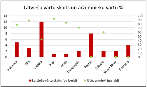 Kopumā Virslīgā latviešu īpatsvars ir lielāks – 59.7%.