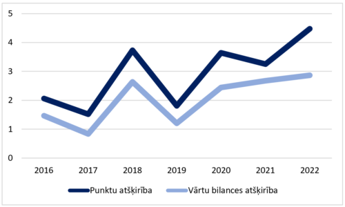 Redzams, ka 2018., 2020., 2022. gada (pieliku klāt šim grafikam, lai salīdzinātu, kā pieaugusi nevienlīdzība starp komandām) sezonas ir ļoti augstu šajā sadalījumā, bet 2017. gada šajā griezumā (21./22.), kurā tika salīdzinātas visas līgas, būtu viszemāk – šis gads izceļas ar komandu vienlīdzību.