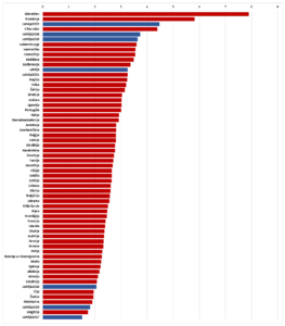 Salīdzinot Latvijas 2021. gada sezonu (tumši zilā Latvija) ar pārējām Eiropas valstu augstākajām līgām, Latvija redzama pašā augšā, tur, kur ir lielākā komandu nevienlīdzība (piebilde: Gibraltāra čempionāts ir tik augstu, jo, pirms komandas sadalījās divās grupās (vienā 6, otrā 5 komandas), tika aizvadītas tikai 10 spēles, kas palielina iespēju, ka uzrādīsies lielāka atšķirība, piemēram, kā bija šogad Virslīgā, un Bulgārijas līga, jo lejasgala komandai atņēma 22 punktus soda dēļ, bez tā Latvijas šī gada Virslīga būtu 2. nevienlīdzīgākā).
