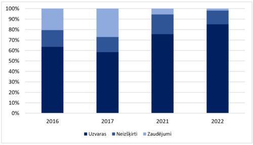 10. maijs bija īpaša diena Virslīgā, jo todien “Tukums” uzvarēja “Audu”, proti, ne Top 5 komanda uzvarēja Top 5 komandu, kas šogad ir retums. Taču 22. jūnijā notika vēl lielāka spēle – “Tukums” viesos ar 2:1 uzvarēja liepājniekus, kas ir pirmā un pagaidām vienīgā uzvara šogad ne Top 4 komandai pret Top 4 komandu. Tas labi redzams augšējā grafikā, kurā ir 2016., 2017. gada un 2021., 2022. gada sezonas, aplūkojot šo rādītāju – Top 4 komandu uzvaras, neizšķirti un zaudējumi pret ne Top 4 komandām.