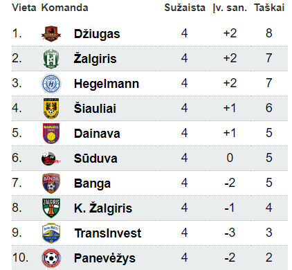 Wprawdzie Hegelmann, Żalgiris Wilno i Szawle trzymają się w czołówce, jednakże nie mają dużej przewagi, w końcu to tylko 4 kolejki. Na przekroju sezonu strata 5 punktów jest spokojnie do odrobienia, aczkolwiek dużo namieszać mogą europejskie puchary, i to jak Poniewież zdoła pogodzić je z ligą, w zależności od tego jak daleko w nich zajdzie.
