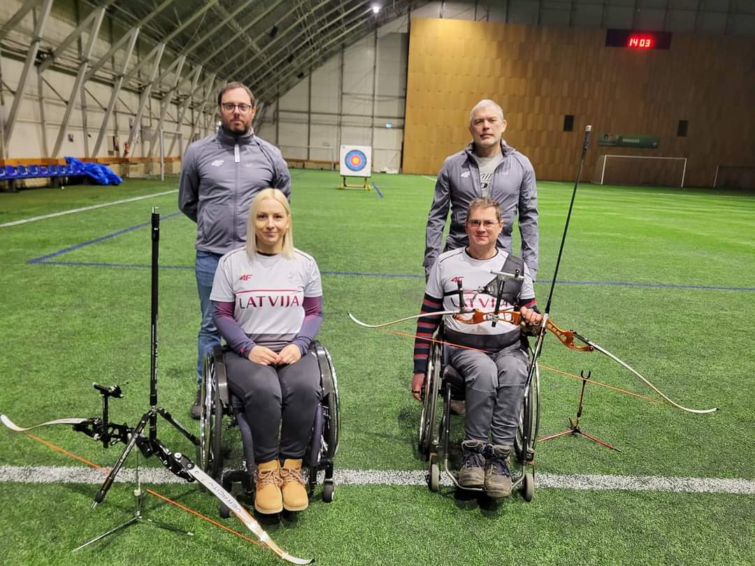 Ieva Melle i Gints Jonasts, którzy będą reprezentować Łotwę na MŚ w łucznictwie niepełnosprawnych w Dubaju, mogli odbyć dziś trening w nietypowych dla tej dyscypliny sportu okolicznościach. Strzelali bowiem na murawie piłkarskiej.
